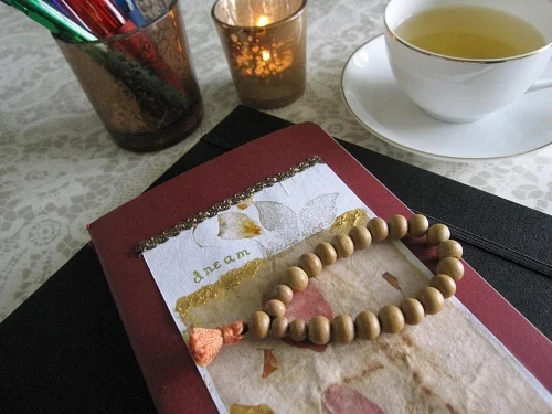 Here's Tracy's morning moment & essentials. Tea, light, and rainbow pens. This Dream journal is a moleskine journal that Tracy's embellished. Such a soulful and tranquil creative space! You'll find her art and jewelry on her blog Prana Light, along with Tracy's writings about "creative living where art & spirit meet".