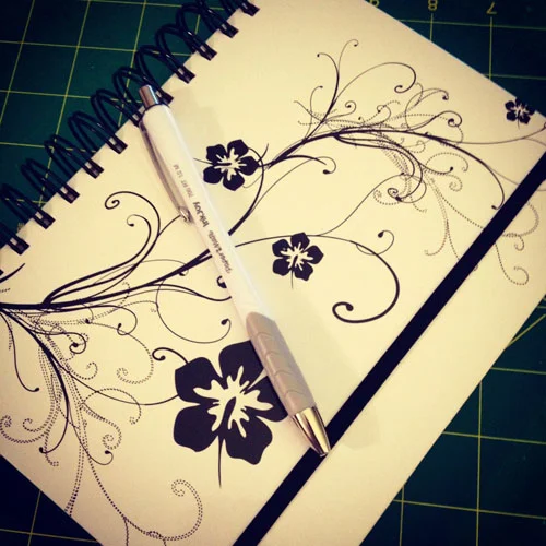 This is designer and illustrator Jennifer Lynn Bishop's creative tools. A yellow notebook with a swirly and organic pattern that contrasts with the straight, diagonal and checked lines. A very clever composition! Jennifer loves music and is currently working on her online coloring book. You will find her work on her portfolio/design blog Rainy Day Doodle or on her Flickr page.